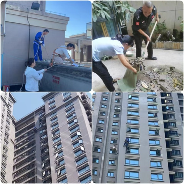 為排除服務中的小區內安全隱患,中晟基業物業服務處聯系專業高空作業人員對雙灣國際的外墻瓷磚進行全方面的